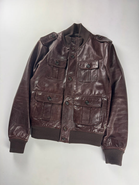 Prada Marlboro Brown Multi Pocket Leather Bomber Jacket FW 2008 - M