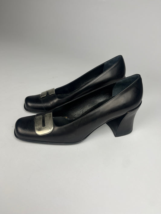 Prada Metallic Buckle Black Leather Pumps 2000s - 38 IT/39 EU