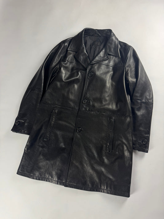 Prada Pure Black Buttoned Minimalist Leather Long Coat FW 2001 - L