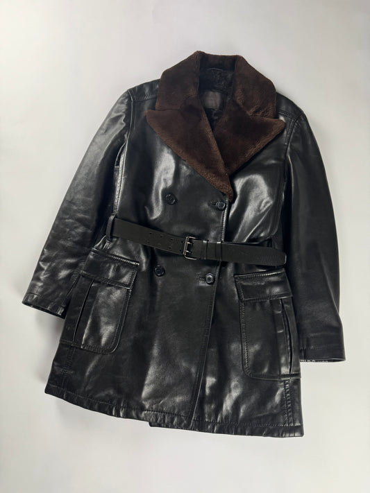 Prada Inside Fur Double Breasted Belted Leather Coat FW 1996 - S
