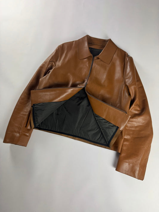 Prada Cognac Premium Leather Double Zipper Padded Layer Minimalist Jacket FW 2000 - L