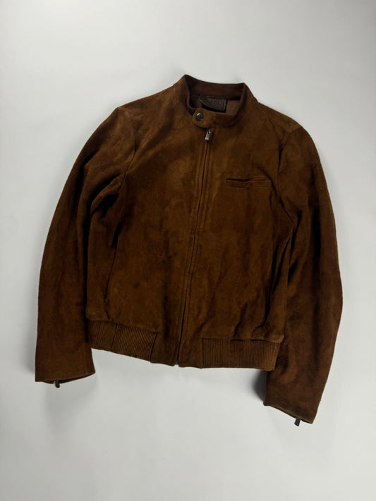 Prada Sample Havana Brushed Suede Canvas Leather Moto Jacket FW 2013 - M