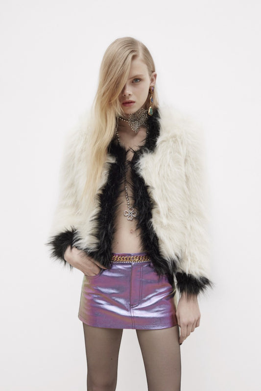 Saint Laurent Monochrome Cream Black Faux Fur Cropped Jacket FW 2021 - XS