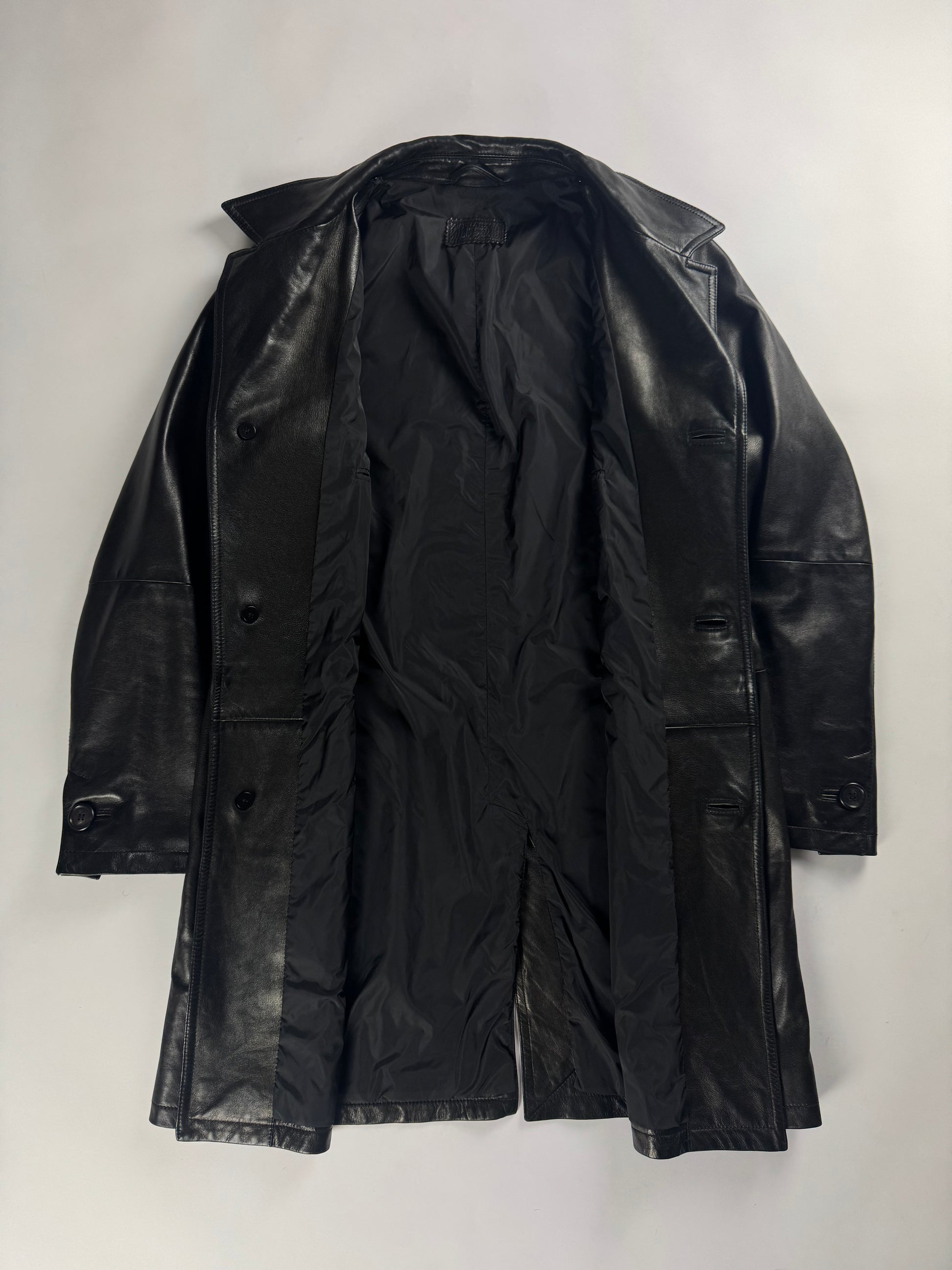 Prada Pure Black Buttoned Minimalist Leather Long Coat FW 2001 - L